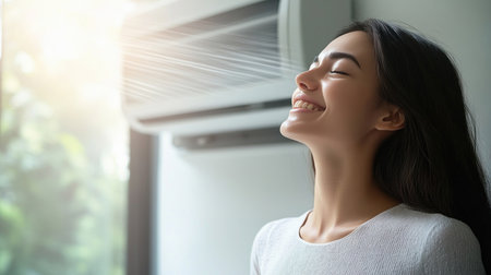 Young woman is smiling while enjoying the cool air flow from her air conditioner at home