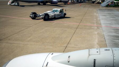 ANTALYA, TURKEY - JULY 25, 2018: wng of Turkish Airlines Airbus plane, Antalya international airport. Pushback tractor for moving luggage at the international airport