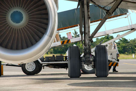 Ground airline personnel overlooking cargo and luggage loading in a commercial airliner or jet plane parked on the tarmac and with details of the jet engine turbine, the conveyor belt and the wing landing gear.