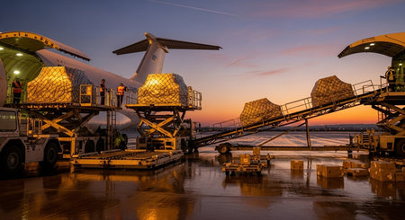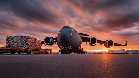 C 17 globemaster iii on airport tarmac with cargo pallets on trolleys, silhouetted against a dramatic orange sunset sky, symbolizing global airlift and logistics operations