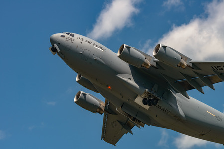 NEW WINDSOR, NY - JULY 2, 2017: Giant C-17 Globemaster III taking off at Stewart International Airport during the New York Airshow.