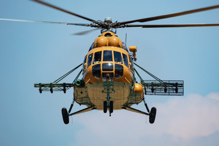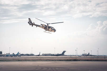 Untitled military helicopter at air base. Air force and army flight transportation. Aviation and rotorcraft. Transport and airlift. Military industry. Fly and fly. Commercial theme.