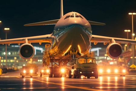 Airplane on the road at night. Transportation and logistics concept.