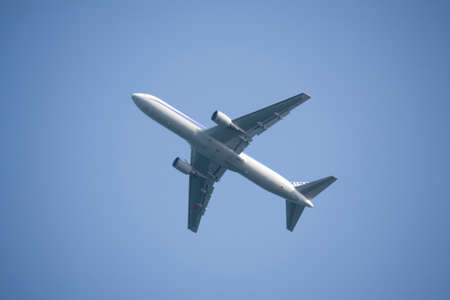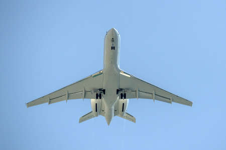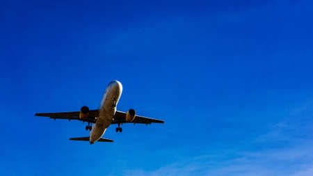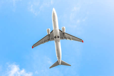 Under view of airplane flying. Commercial airline flying on blue sky