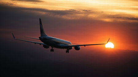 A beautiful silhouette of an airplane flying into the sunset, with a colorful sky and wispy clouds creating a dramatic scene that captures the essence of travel