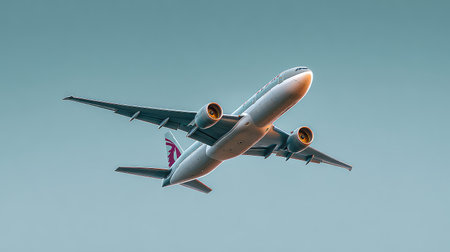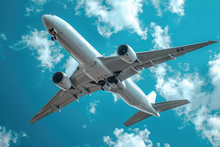 Stunning image of a commercial airplane flying high in the sky, showcasing the beauty of aviation and the thrill of travel with a captivating perspective and vibrant lighting.