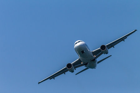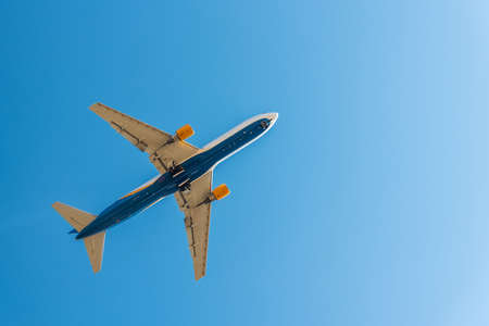 Airplane taking off, bottom view - Travel by aircraft. Air transport concept with empty space for text