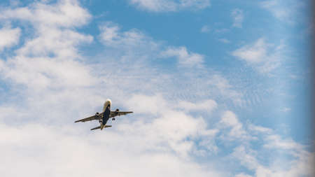big european airplane flying for people against blue sky with clouds in the afternoon on summer day