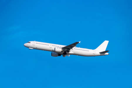 Passenger plane is taking off into the blue sky side view