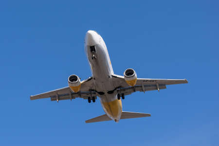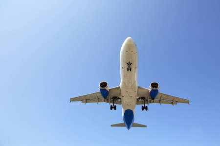 Large airplane preparing the landing with a blue sky