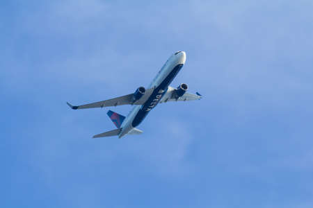 HIGHLANDS, NEW JERSEY - July 26, 2017: a Delta Airlines jet flies over Sandy Hook