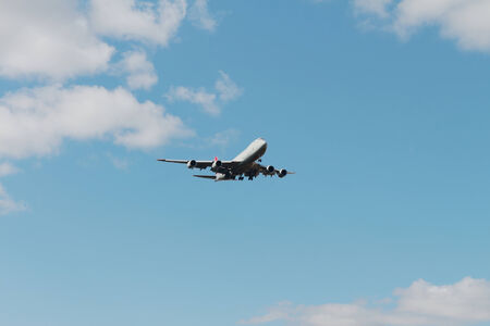 An airplane flying in the spring sky. Richmond BC Canada