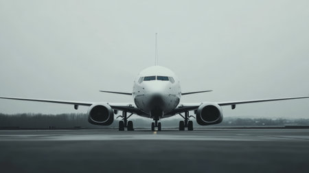 Sleek passenger airplane waits on the runway under cloudy skies, ready to take off on its next journey