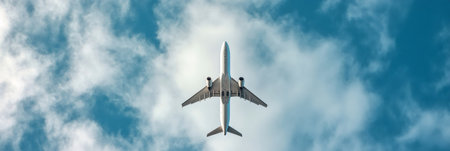 Modern passenger airplane soaring high above the clouds in a vibrant blue sky, capturing the essence of travel, business, and the exhilarating feeling of freedom