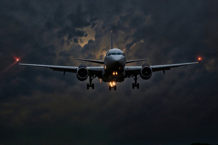 Plane landing in dusk with headlights on