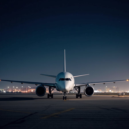 View to the cockpit and engines of parked airliner in airport at night