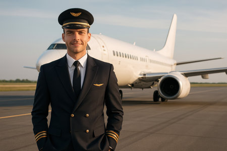 Confident male pilot in front of an airplane, epitomizing professionalism in aviation.