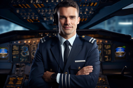 Confident male pilot in uniform smiling inside the cockpit. Professional airline captain with arms crossed, showcasing leadership and readiness.