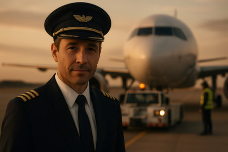 Confident airline pilot in uniform looking at camera, airplane in background ready for takeoff at sunset