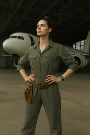 Confident female aircraft mechanic in a green jumpsuit standing with hands on hips inside a hangar, with a large airplane in the background.