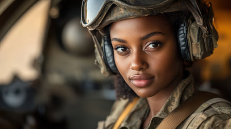 A focused female soldier sits inside a military vehicle, wearing tactical gear and a helmet, showcasing readiness and determination during a mission.