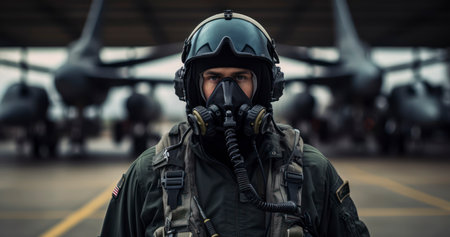fighter pilot and fighter jet, military plane pilot, pilot in helmet, goggles and protective mask, generative AI.