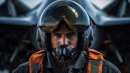 Close-up portrait of a fighter jet pilot. Adrenaline surging as the fighter pilot navigates the vast blue sky, soaring towards victory. A breathtaking display of skill and precision.