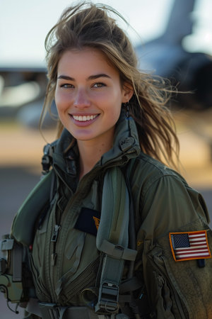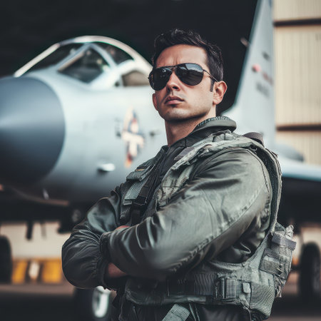 Confident fighter pilot besides his aircraft, embodying air force expertise and courage.