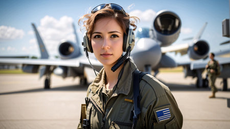 A determined woman pilot adjusts her helmet beside a jet aircraft, showcasing her professional military gear and readiness for flight in a dynamic airbase setting.