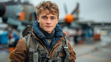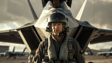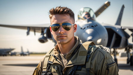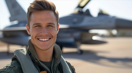 Confident male pilot in uniform poses before a fighter jet, representing aviation, military strength, and professionalism.