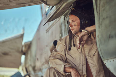 Caucasian male air force officer is confident in piloting a fighter jet.