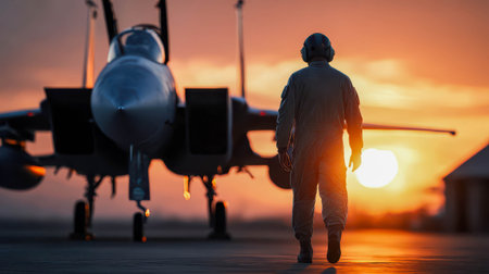 Pilot in flight suit standing near a fighter jet at sunset, symbolizing aviation, courage, and military precision.