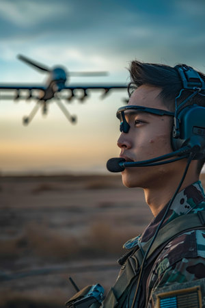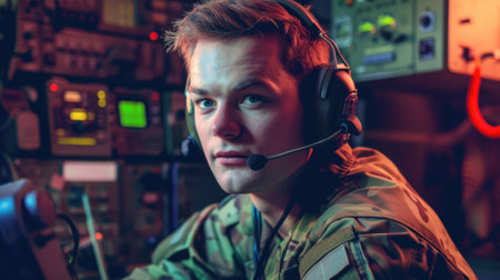 Military personnel operates advanced technology in a high-tech cockpit during a night mission at a secure location. Generative AI