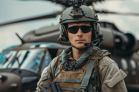 Military pilot wearing helmet with night vision camera posing near helicopter