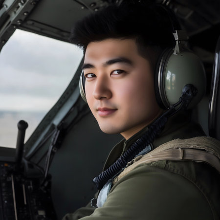 Portrait of a young male Asian pilot in a helicopter cockpit.
