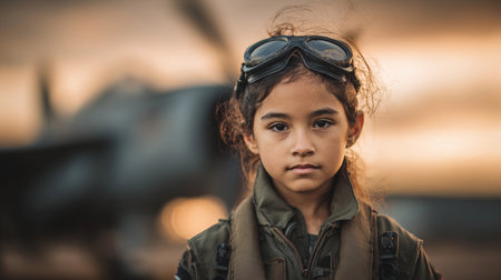 Young aviator in flight gear stands confidently in front of a vintage aircraft at sunset, showcasing dreams of flight and adventure in a picturesque setting