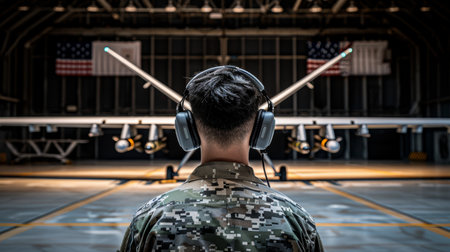 Military personnel overseeing surveillance drone in high-tech hangar ready for deployment.