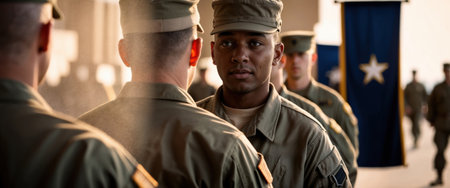 Young Black soldiers in uniform, American flag background
