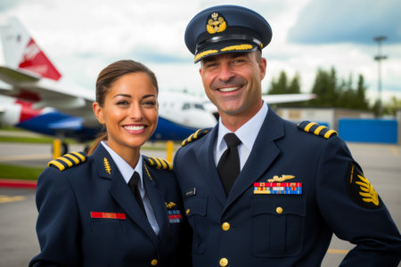Portrait of confident pilot and stewardess standing in front of airplane
