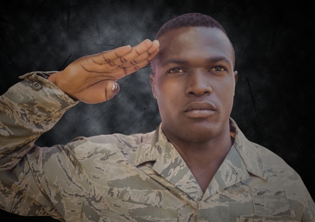 Digital composite of Soldier saluting against black grunge background