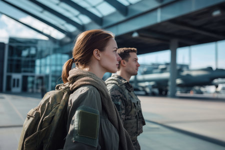 Two soldiers in uniform stroll through a military terminal under bright sunlight, showing camaraderie.