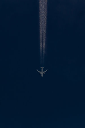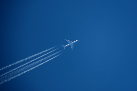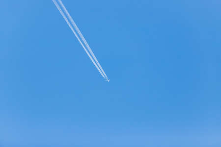 Airplane in a blue cloudless sky with contrails without clouds, Germany