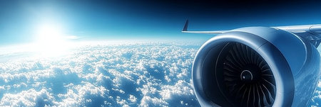 Modern Airplane Engine Soaring Above the Clouds, Golden Hour Light, Aviation and Travel Concept