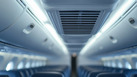 An empty airplane cabin features bright lighting and overhead air vents, creating a clean and modern setting.