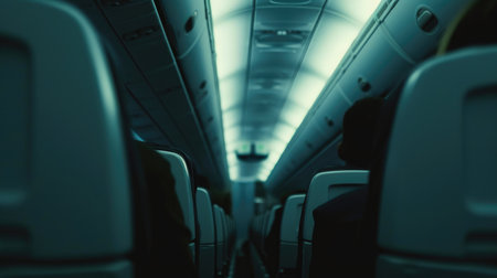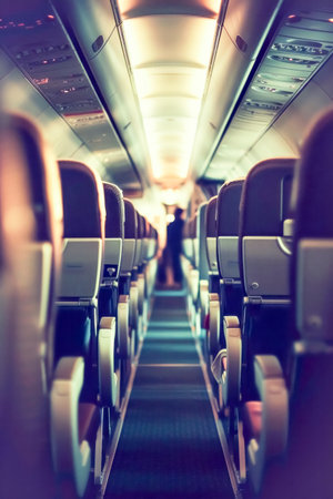 A softly blurred view of an airplane interior in flight, capturing the essence of travel, adventure