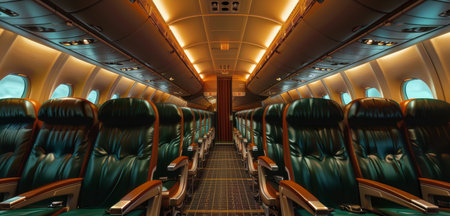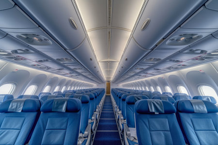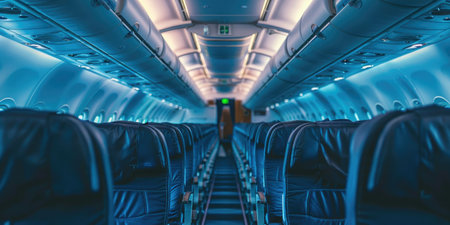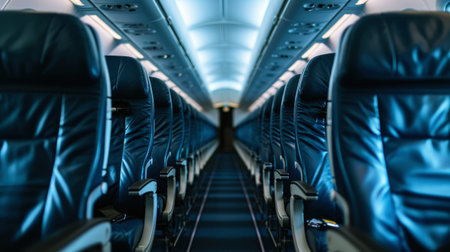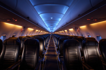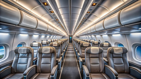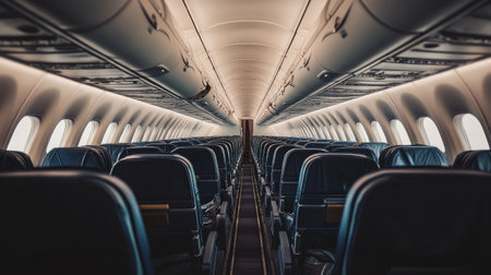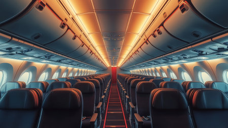 Empty Airplane Cabin with Rows of Seats and Modern Lighting. High quality photo