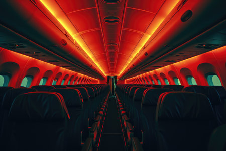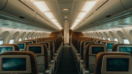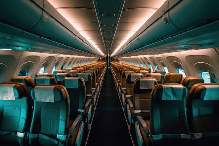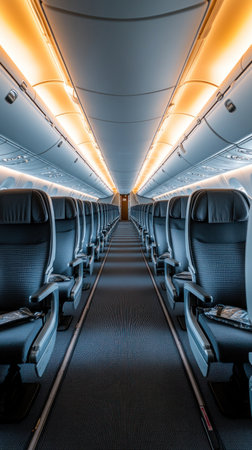Rows of empty seats stretch down the aisle of a contemporary airplane cabin, illuminated by warm overhead lighting
