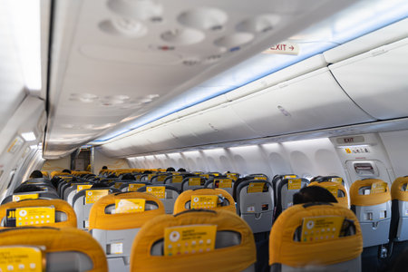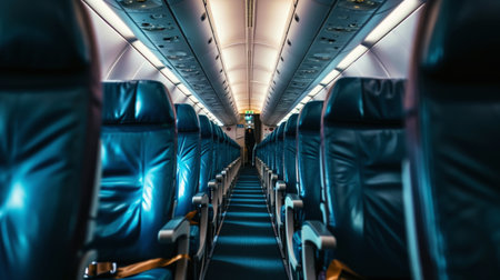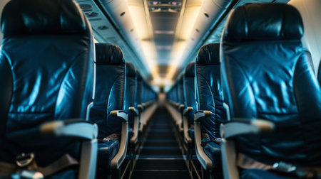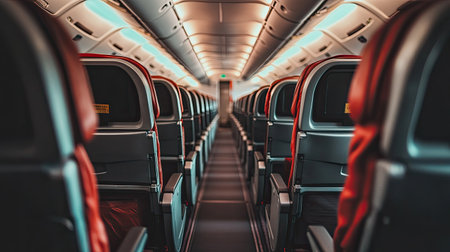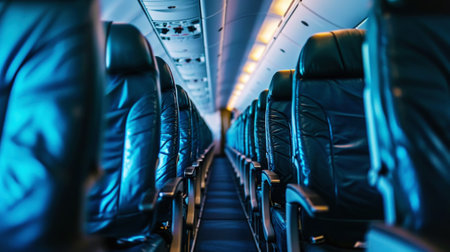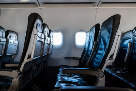 Our stock image captures modern seats on an airplane, providing a unique perspective of the interior corridor. Experience contemporary travel with comfort and style