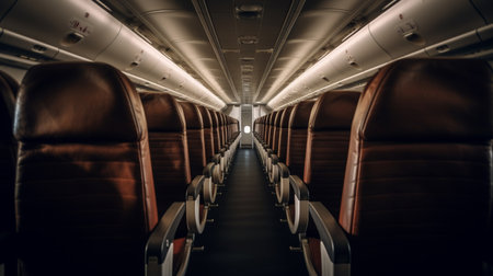 Empty passenger airplane seats in the cabin. Interior of passenger plane. Generative Ai