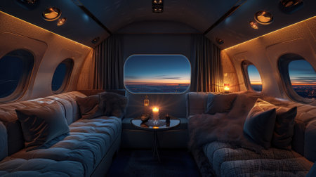 Serene airplane interior with a glimpse of sky from cozy seats perfect for travel and vacation vibes